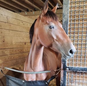 Murphy's Malachy - "M&M", is a 17.1 hand bay Thoroughbred gelding. M&M came to On The Bit Farm from Irish Mist Farm in June of 2011. He has excelled in his training while at On The Bit Farm and is an exciting challenge for our more ambitious and experienced riders looking to feel the power behind a dressage horse.